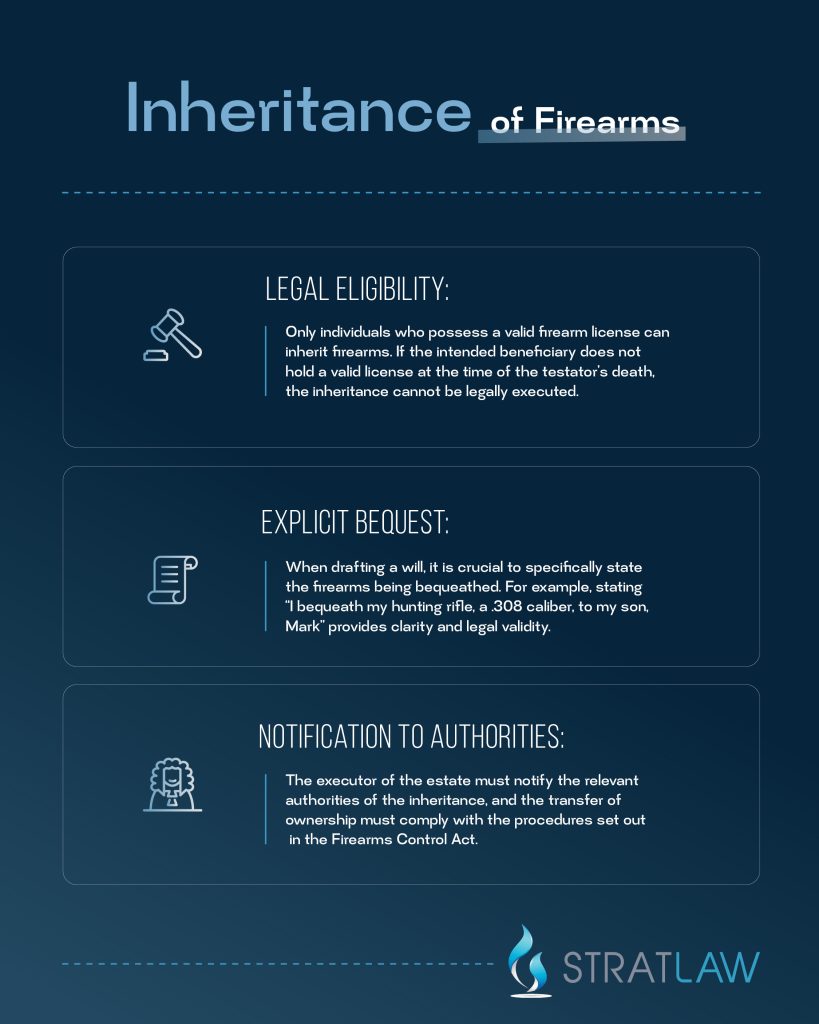 In South Africa, the inheritance of firearms is subject to strict regulations under the Firearms Control Act, 2000. Specific considerations include: